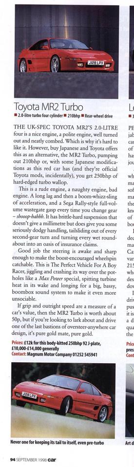 The Story behind the car ..Well it all began with a base model 1991 120bhp UK Coupe with a 3S-FE engine which I bought in December 1996, with 72,000 miles on the clock. This was the car that really got me hooked on MR2's - the 120hp engine wasn't very powerful, but the handling always brought a smile to my face. After 18 excellent months driving it (and feeding it 10W40 engine oil) I started looking for a replacement MR2 - initially it was going to be a UK spec MR2 GT with 158hp, but when I test drove a 1992 Japanese MR2 Turbo out of curiosity I knew that this was the only way to go - 220 bhp with an unforgettable combination of low end torque and top end power all thanks to the Turbo. Even with the added hassles of getting parts and insurance for a car that was never sold in the UK, I decided it was still well worth it. I then spent 4 months looking for a non modified MR2 Turbo, in good condition with service history. Having seen 6 or more Turbos, I found very few that were both unmodified and in good mechanical condition - many arrive in the UK direct from Japanese auctions, and so their quality is very variable. The car I bought was the only one that was in good original mechanical condition, with a low mileage, and even a service history - something very rare for an import. Driving the MR2 Turbo