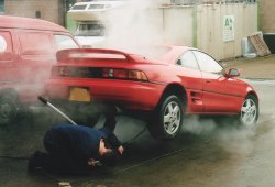 OK, so what's under the bonnet then ?Well, the short answer is a heck of a lot - the engine which powers the MR2 turbo is the same engine (3S-GTE) as is in the Celica GT4 turbo, delivering around 220bhp in the 1993 model year. They're as tough as old boots, as you'd expect of any Toyota - from the US MR2 mailing list, there are cars that have done over 230,000 km. There are a number of UK Spec Mk2's I have driven, one with 156,000miles, and the other with 130,000 miles, both of which were still running strong, so there is plenty of life in the engine! The turbo itself is reliable, but you need to bear in mind that after a hard drive the turbo ideally needs a cool-off idle period. If the engine is shut down with the turbo too hot, it is possible that the heat could cause non-synthetic oils to break down, and it is possible that the oil lines going to the turbo over time become constricted by oil which is baked to the walls of the feed pipes. This can then lead to lack of lubrication and eventual turbo failure through oil starvation. I generally ensure I drive the car gently on the last few minutes of any journey allowing it to cool off - and then let it idle for a while once parked whilst I sort myself out.